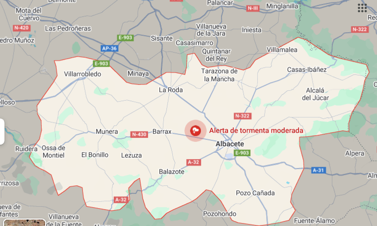 Paras todas estas comarcas de las provincias de Albacete y Cuenca, AEMET también ha emitido avisos de nivel amarillo por tormentas, que podrán ir acompañadas de granizo, no descartándose que localmente sea de gran tamaño. Todos los avisos tienen como hora de inicio las 17:00 horas.
